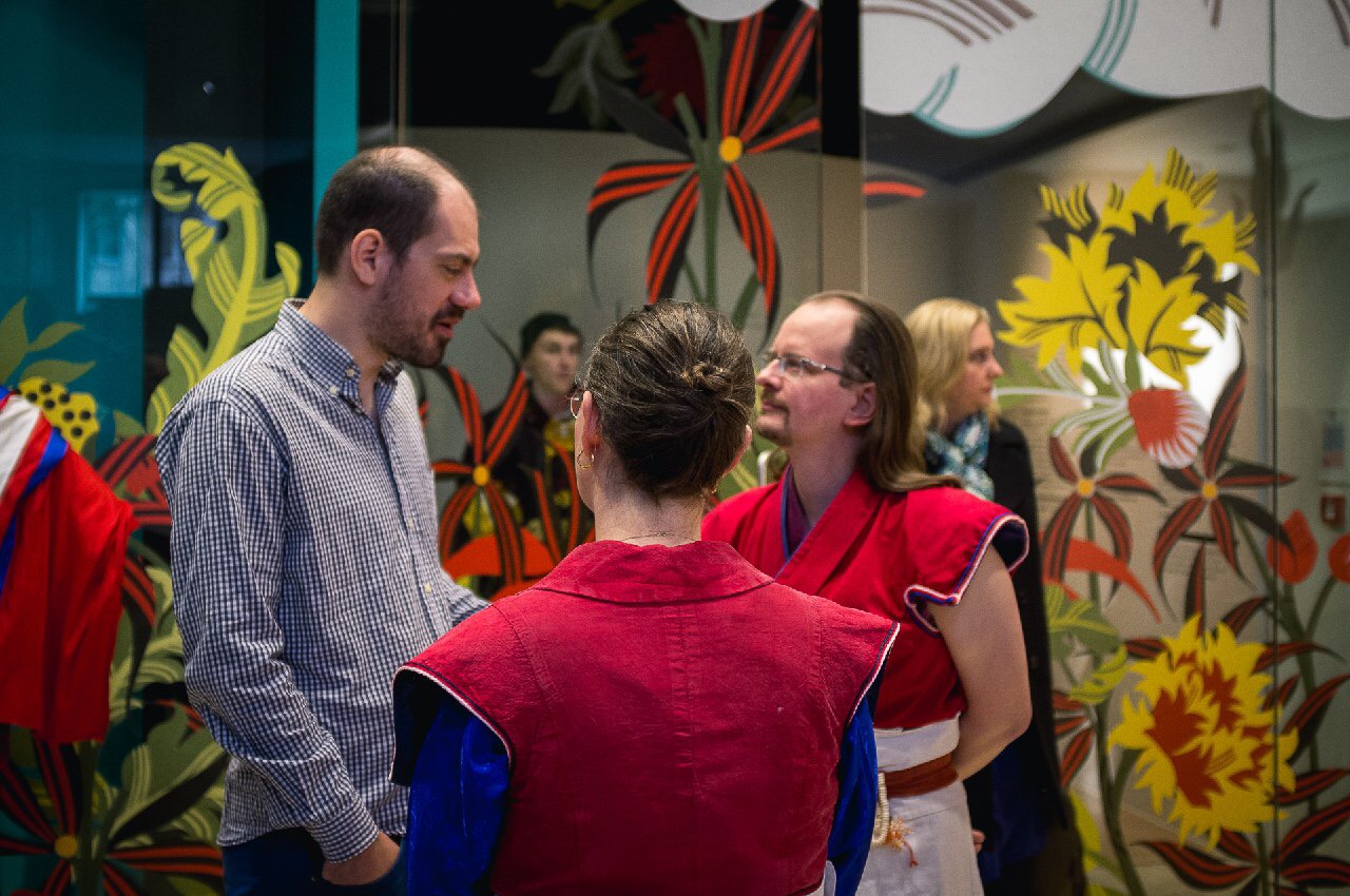 | Ngakpa Namgyal and Ngakma Shé-zér discussing the exhibition with a Vajrayana student |